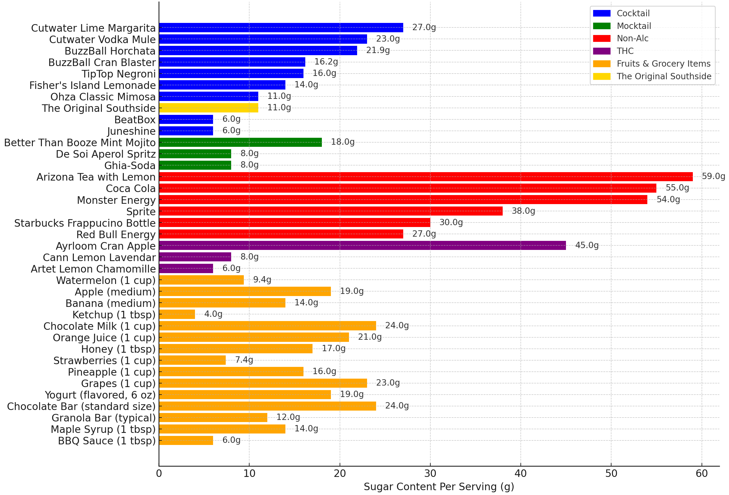 Vice swapping is real, people! We often get asked about the sugar content (11g per serving) in The Original Southside. To put this quantity into perspective, here’s a chart of some popular RTD beverages (alcoholic, non-alcoholic, THC, and “mocktail”) compared to popular fruits and other grocery items.